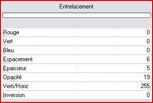 7 - Remplir votre sélection de couleur #ffffff 8 - Effets/Jeux de Lignes/Entrelacements réglages ci-dessous :