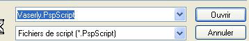1 – Installer les filtres, le script, le masque, les sélections dans les dossiers correspondants de Mes Fichiers PSP. La police dans le dossier Font. 2 – Fichier/Script/Exécuter/Scripts réglementés/sélectionner le script vaserly/OK.