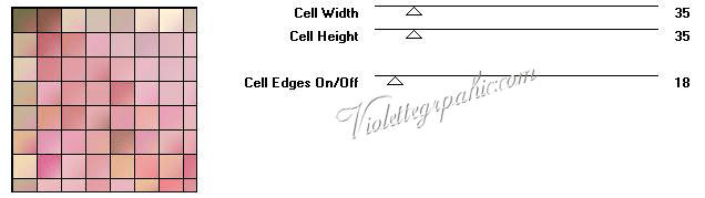9 – Ouvrir l’image « Eye »/Calques/Nouveau calque/Remplir de dégradé/Désélectionner. 10 – Filtre/Toadies/Plain Mosaïc Blur identique n° 5 11 – A l’aide la baguette magique, tolérance :0 sélectionner la grille 12 – Remplir de motif or. Désélectionner. Baisser l’opacité à 40/50%. 13 - Calques/Fusionner les calques visibles.