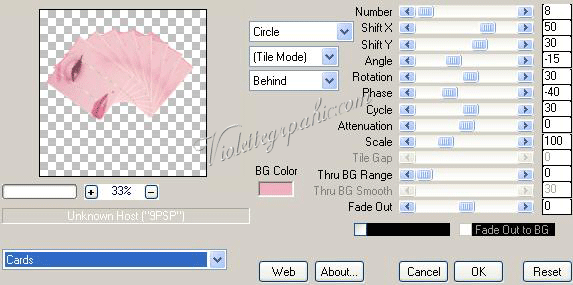 14 – Image/Ajouter des bordures : 1 pixel couleur foncée. Edition/Copier 15 – Edition/Coller sur la première copie laissée en attente. Dupliquer. 16 – Image/Redimensionner/50%/décocher redimensionner tous les calques. 17 – Effets/Mura’s Meister/Copies/Cards/Réglages par défaut. :