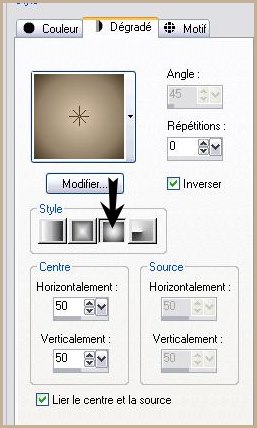7 - Placer en avant-plan la couleur #483822 et en arrière-plan la couleur #dbc7ad 8 - Configurer un dégradé halo/Répétition: 0/Inverser coché
