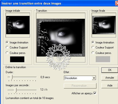 19 - Image/Ajouter des Bordures : 2 pixels noir dupliquer 20 - sur la copie 21 – Sélection/Charger à partir du disque/Sélectionner la sélection ann_sel001_Secreteyes 22 – calque/nouveau calque 23 - sélection/Inverser 24 – remplir de couleur noire 25 - occulter l’image 1/Fusionner les calques visibles double-cliquer sur la première image/Transformer en calque raster 26 - Calques/Agencer/descendre en bas de la pile l’image aux bords noirs doit être en dessous 25 – Enregistrer en pspimage 26 – Ouvrir Animation Shop Ouvrir votre image 27 - Effets/Effets de transition :