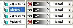 16 - Redimensionner à 50%/ Déplacer vers la gauche environ à 1 cm du bord et au milieu du tableau. Renommer calque 5. Dupliquer et fermer ce calque n°6. 17 – Travailler sur le calque n° 5 du dessous. 18- Répéter n° 12/13. Ouvrir le calque supérieur.