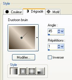 1 – Installer le dégradé et les filtres dans Mes Fichiers PSP. La police dans le dossier Font. 2 – Ouvrir le tube le dupliquer et fermer l’original. 3 – Aller rechercher votre dégradé Duotoon bruin linéaire, angle 45°, répétition 1