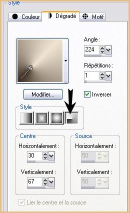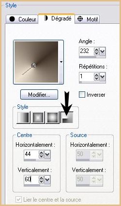 3 - Configurer un dégradé radial angle: 232°/Répétition: 1