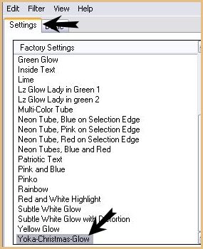 55 - Effets/Alien Skin Eye Impact 5/Gradient Glow: Preset Yoka-Chrismas-Glow réglages précédents 56 - Sélections/Désélectionner 57 - Image/Ajouter des bordures : 2 pixels couleur #403126