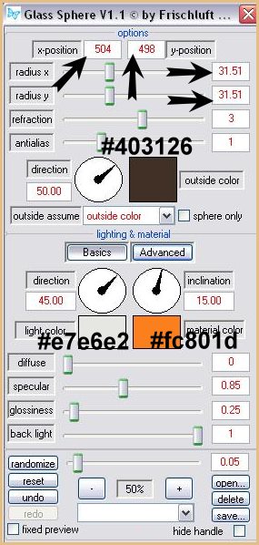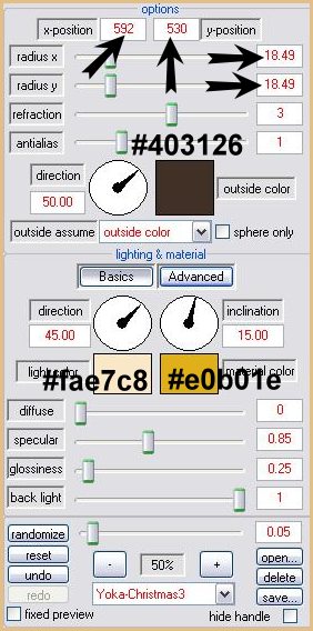 68 - Calques/Fusionner les calques visibles 69 - Effets/Filtre Frisluft /GlasSphere : trouvent le préréglage Yoka-Christmas1 Si vous utilisez des couleurs différentes il faut adapter vos réglages