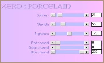 ATTENTION : si vous utilisez un autre tube, il se peut que vous deviez le diminuer Calques/Agencer/Déplacer vers le bas 21 - Calques/Fusionner Tout 22 - Effets/Xero/Porcelain avec les réglages ci-dessous : 23 - Image/Ajouter des bordures : 1 pixel couleur #000000 24 - Image/Ajouter des bordures : 10 pixels couleur #ffffff 25 - Sélectionner la bordure avec la baguette magique ( Tolérance et Progressivité à 0 ) Remplir de dégradé configuré ainsi: