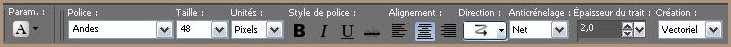 l'outil Texte/Police Andes/Taille: 48/ Trait : 2/ Vectoriel : 36 - Dégradé en Avant-plan fermé/couleur arrière-plan #000000