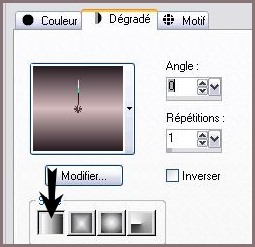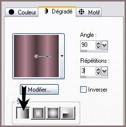 *** 1 - Ouvrir une image de 550 x 440 pixels 2 - Placer en avant-plan la couleur #261b21 et en arrière-plan la couleur #d7bdbf Si vous choisissez d'autres couleurs relever les codes et notez les car les couleurs seront changées de nombreuses fois Configurer un dégradé arrière-plan linéaire angle: 0°/Répétition: 1