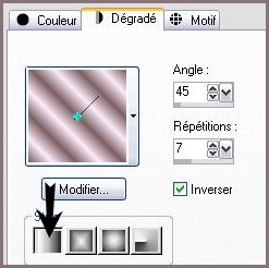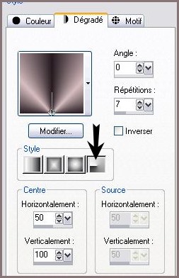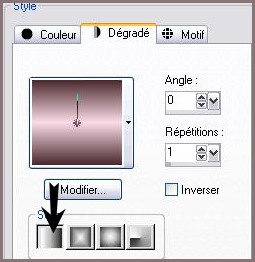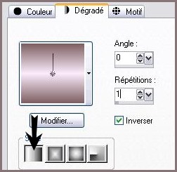 Remplir votre calque avec ce dégradé 21 - Mode de calque : Recouvrement 22 - Sélection/modifier/Contracter de 5 pixels 23 - Sélection/Inverser 24 - Sélection/Flottante 25 - Dans la Palette des calques : clic droit /Convertir en calque normal 26 - Calques/NOUVEAU CALQUE remplir de dégradé réglages suivants :