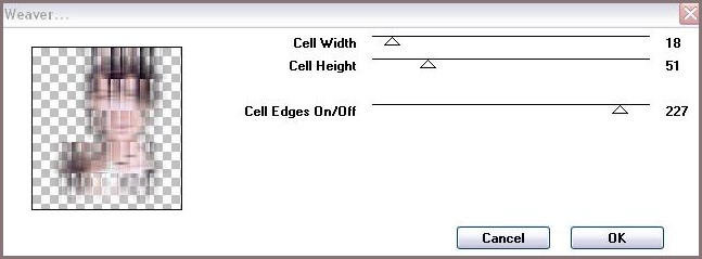 6 - Calques/Supprimer/Calques/Fusionner le groupe 7 - Ouvrir le tube Yoka_JdL_OB3 8 - Edition/Copier/ Edition/Coller comme nouveau calque 9 - Effets/Toadies/Weaver avec ces réglages: