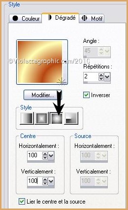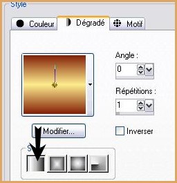 60 - Ouvrir une image de 400 x 550 pixels 61 - Placer en avant-plan la couleur #91300f et en arrière-plan la couleur #fdec8e Configurer en arrière-plan un dégradé linéaire angle: 0°/Répétition: 1