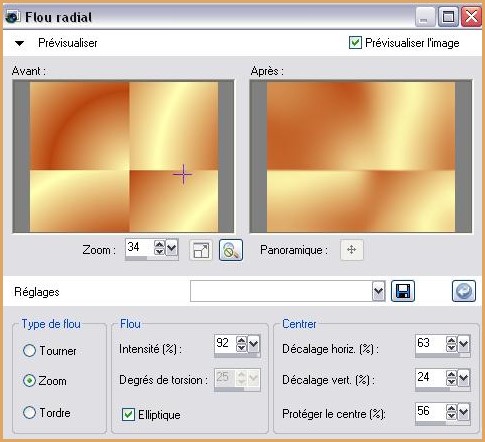 4 - Image/Rotation/Tourner vers la droite 5 - Répéter l'étape 3 6 - Image/Rotation/Tourner vers la gauche 7 - Réglages/Flou/Flou radial avec ces réglages: