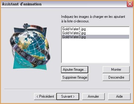 Ouvrir AnimationShop 72 - Fichier/Assistant d'animation : clic sur suivant/suivant/suivant/suivant aller chercher vos images: Gold-Water 1/ 2 et 3