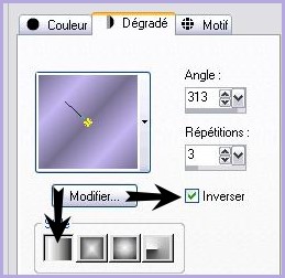 *** 1 - Ouvrir une image transparente de 600 x 640 pixels 2 - Placer en avant-plan la couleur #c4b7f2 et en arrière-plan la couleur #776f90 Configurer un dégradé linéaire angle: 313°/Répétitions: 3/Inverser coché