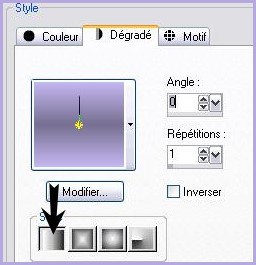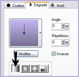13 - Ouvrir une image transparente de 500 x 550 pixels 14 - Placer en avant-plan la couleur #c4b7f2 et en arrière-plan la couleur #776f90 15 - Configurer un dégradé linéaire angle: 0°/Répétition: 0/Inverser coché