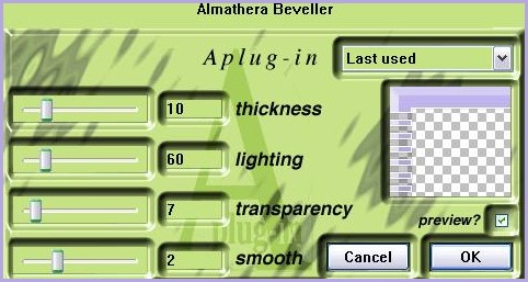 64 - Effets/Effets de bords/Accentuer Davantage 65 - Opacité à 84% 66 - Sélection/Désélectionner 67 - Effets/Almathera/Beveller :