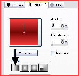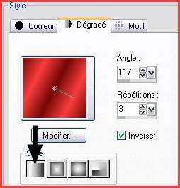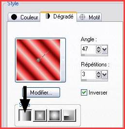 5 - Sélection/Désélectionner 6 - Calques/NOUVEAU CALQUE 7 - Placer en avant-plan la couleur #F83D3D et en arrière-plan la couleur #740808 8 - Configurer un dégradé linéaire angle: 117°/Répétitions: 3/Inverser coché