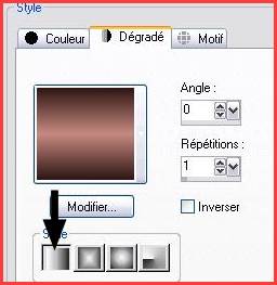 18- Placer en avant-plan la couleur #2E1613 et en arrière-plan la couleur #C68980 19 - Configurer un dégradé linéaire angle: 0°/Répétition: 1