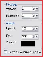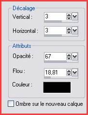 Entrer votre nom 59 - Calques /Convertir en calque raster 60 - Effets/Effets 3D/Ombre Portée