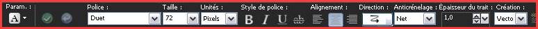 57 - En avant-plan couleur #b32121 /arrière-plan couleur #740808 58 - Activer l'outil Texte/Police Duet/taille : 12