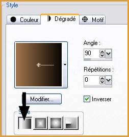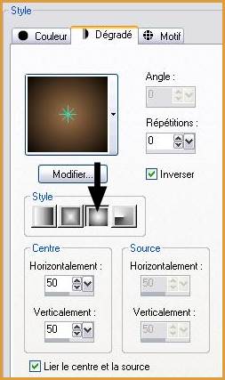 *** 1 - Ouvrir une image de 650 x 350 pixels 2 - Placer en avant-plan a couleur #0a0704 et en arrière-plan la couleur #a2754c Faire un dégradé avant-plan avec ces institutions :