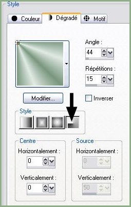 11 - Sélection/Inverser 12 - Placer en avant-plan la couleur #78967d et en arrière-plan la couleur #e0eae4 13 - Configurer un dégradé radial angle: 44°/Répétitions: 15