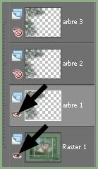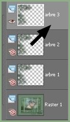 73 - Dans la Palette de calques/Dupliquer deux fois Renommer vos calques : arbre 1/ arbre 2 et arbre 3 74 - Fermer le calque du fond Fermer les calques arbre 1 et arbre 2 Activer le calque arbre 3 :