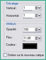 14 - Opacité à 86% 15 - Sélection/Inverser 16 - Calques/NOUVEAU CALQUE 17 - Ouvrir l'image GreenEye.jpg Si vous choisissez une autre image il faut avoir un élément rond au centre 18 - Edition/Copier 19 - Edition/Coller dans la sélection 20 - Sélections/Désélectionner 21 - Effets/Effets 3D/Ombre Portée :