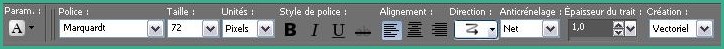 22 - Calques/Fusionner les calques visibles 23 - Image/Ajouter des bordures : 1 pixel couleur #010807 24 - Image/Ajouter des bordures : 5 pixels couleur #7ecbe9 25 - Image/Ajouter des bordures : 1 pixel couleur #010807 26 - Placer en avant-plan la couleur #e8e2e2 / et en arrière-plan la couleur #6e4e4e 27 - Activer l'outil Texte/Police Marquardt/Taille: 72/Vectoriel /épaisseur du trait : 1