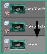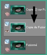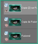 29 - Calques /Convertir en calque raster 30 - Calques/Fusionner les calques visibles 31 - Calques/Dupliquer 32 - Calques/Dupliquer Nous avons trois calques 33 - Fermer les deux calques inférieurs/Activer le calque supérieur :