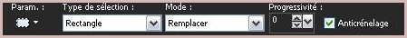 15 - Tracer votre forme en partant un peu au-dessous du coin gauche supérieur 16 - Calques/Convertir en calque rasterCalques/Dupliquer 17 - Image/Miroir 18 - Activer l'outil sélection rectangle configuré ainsi: