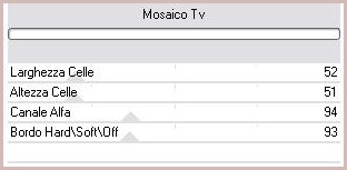 28 - Calques/NOUVEAU CALQUE 29 - Remplir votre sélection de dégradé 30 - Gardé sélectionné 31 - Effets/Italian Editors/Mosaïque Tv réglages suivants : 32 - Sélection/Désélectionner si vous avez choisi votre propre image , les dimensions peuvent être différente de celle fournie et la petite bande de dégradé ne remplit peut-être pas votre image. Faire alors votre sélection . 33 - Calques/Dupliquer 34 - Image/Miroir 35 - Calques/NOUVEAU CALQUE 36 - En avant-plan le dégradé Yoka-FormyFriend-verloop configuré comme au n°27 37 - Activer l'outil pinceau et localiser le pinceau Yoka-les-FmF-penseel