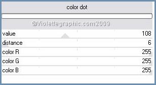 3 - Ouvrir une image transparente de 750 et 450 pixels 4 - Effets/Pentacom/color dot : 107/6/255/255/255