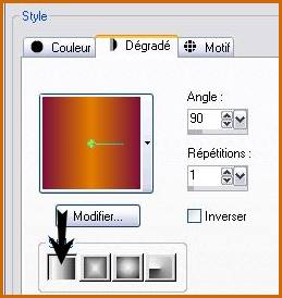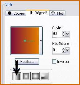 2 - Placer en avant-plan la couleur # 7d1139 et en arrière-plan la couleur #e27d00Configurer un dégradé linéaire angle: 90°/Répétition: 0
