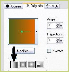 2 - Placer en avant-plan la couleur # 50601b et en arrière-plan la couleur #e36700Configurer un dégradé linéaire angle: 90°/Répétition: 0