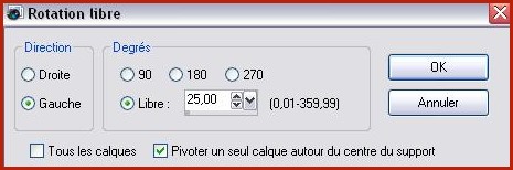 9 - Calques/Dupliquer 10 - Image/Redimensionner à 30%/décocher " tous les calques" 11 - Image/Rotation libre de 25° à gauche/décocher " tous les calques"