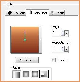 2 - Placer en avant-plan la couleur #802e19 et en arrière-plan la couleur #fcb16c Configurer un dégradé linéaire angle: 0°/Répétition: 0