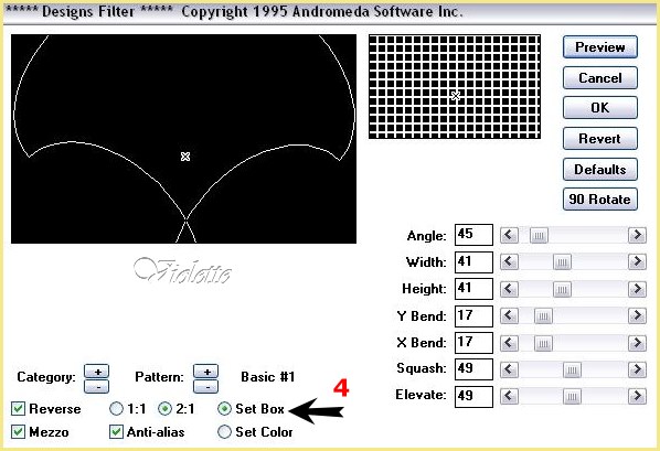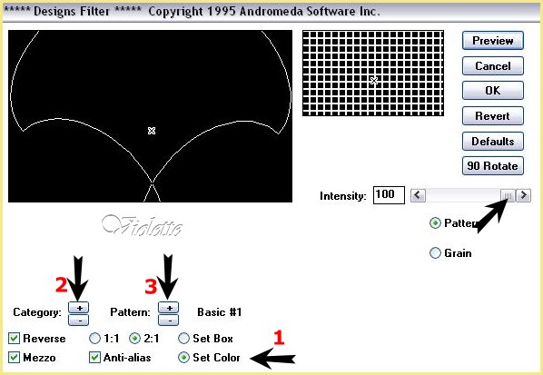 4 - Effets/ Andrómeda/ Designs a - Cliquer sur Set Color puis sur Category et ensuite sur pattern : choisir Basic #1
