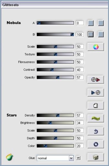 4 - Calques/Nouveau calque 5 - Effets/ Filtre Flaming Pear /Glitterato réglages ci-dessous: Couleur des nuages #9eb2c3