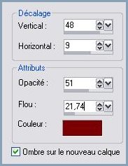 16 - Effets/3D Effets/Ombre Portée : 48/9/51/21,74/#7b0306 Mode du calque de l'ombre : Eclaircir