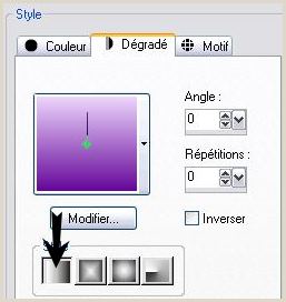 2 - Placer en avant-plan la couleur #640799 et en arrière-plan la couleur #edd4fc Configurer un dégradé linéaire angle: 0°/Répétition: 0
