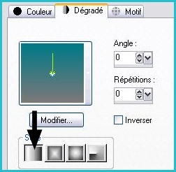3 - Placer en avant-plan la couleur #7c7878 et en arrière-plan la couleur #007987 Configurer un dégradé linéaire angle: 0°/Répétition: 0