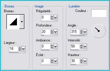 23 - Image/Ajouter des bordures : 30 pixels couleur #ffffffSélectionner la bordure avec la baguette magique Remplir de couleur #007987 **Effets/Effets 3D/Biseautage extérieur :