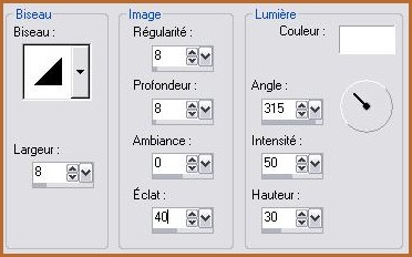 7 - Sélections/Contracter de 10 pixels **sélection/Inverser **Sélection/Flottante 8 - Effets/Effets 3D/Biseautage Intérieur :