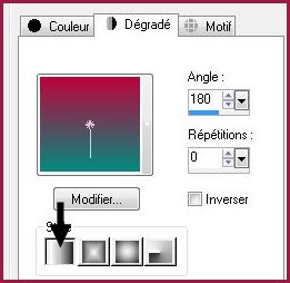2 - Placer en avant-plan la couleur # bd033b et en arrière-plan la couleur #038a7fDans la Palette de Style Configurer un dégradé linéaire angle: 180°/Répétition: 0