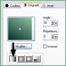 3 - Image/Image en négatif 4 - Calques/Nouveau calque Remplir de dégradé linéaire angle: 30°/Répétition: 0avant-plan couleur #07302e/arrière-plan couleur #8dc69c