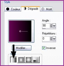 2 - Placer en avant-plan la couleur #000000 et en arrière-plan la couleur #660451 Configurer un dégradé linéaire angle: 90°/Répétition: 0/Inverser coché