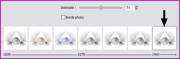 10 - Effets/Effets de Photo/ Chronologie: intensité : entre 35 et 65/ bords photo décoché/Traitement croisé